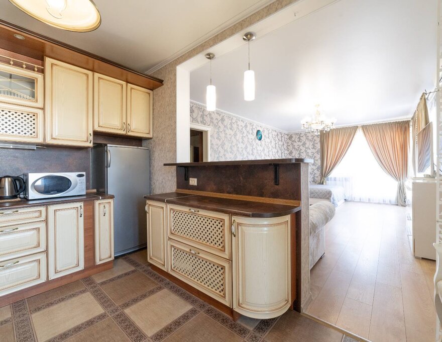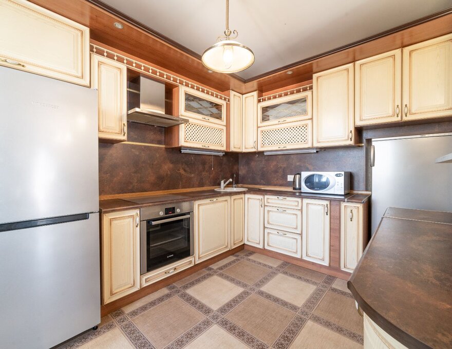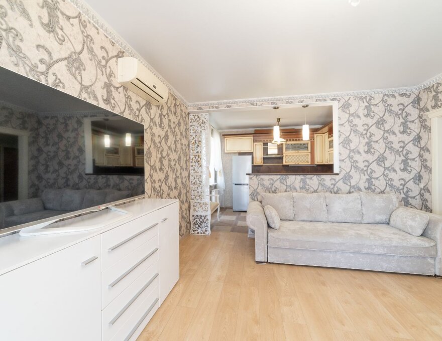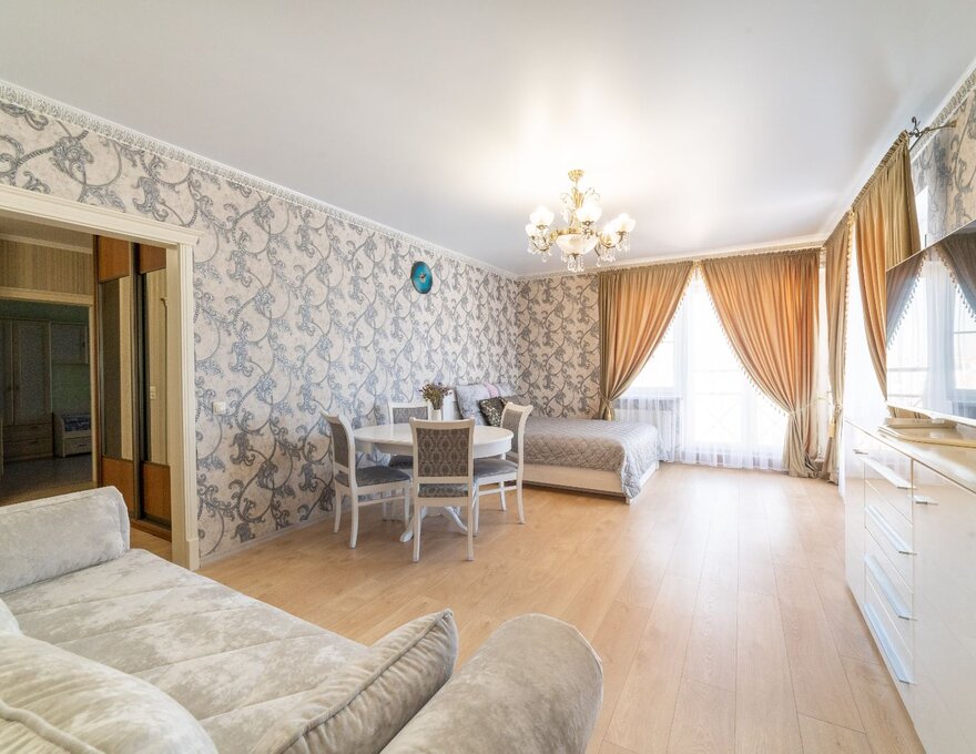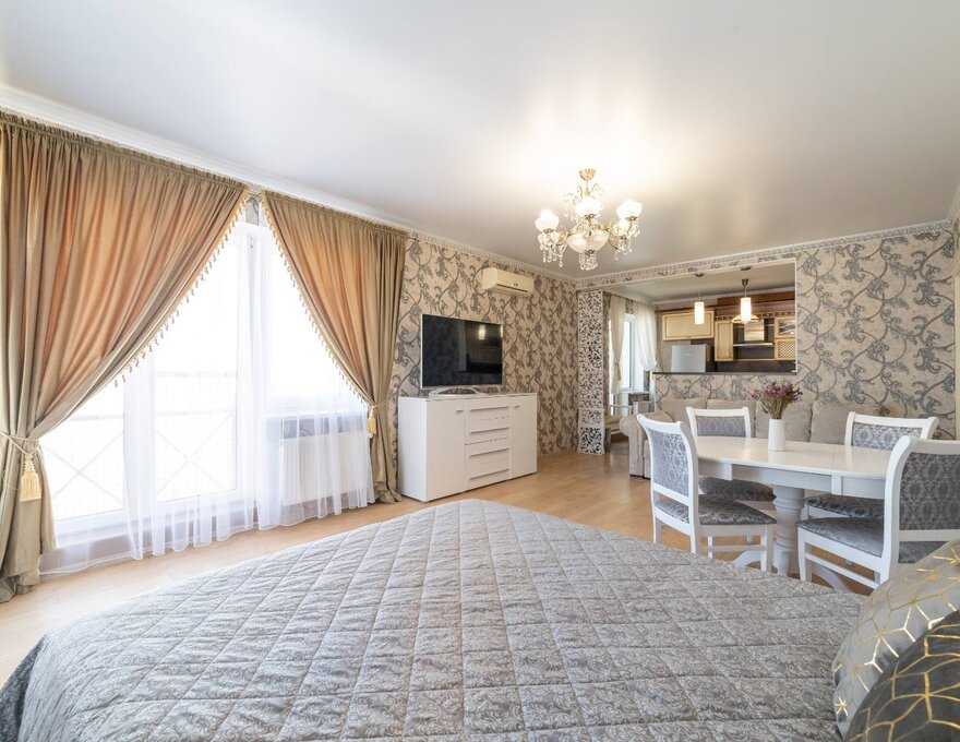 Апартаменты состоят из большой гостиной совмещенной с зоной столовой и кухней, двух изолированных спален с дверями, раздельного санузла.