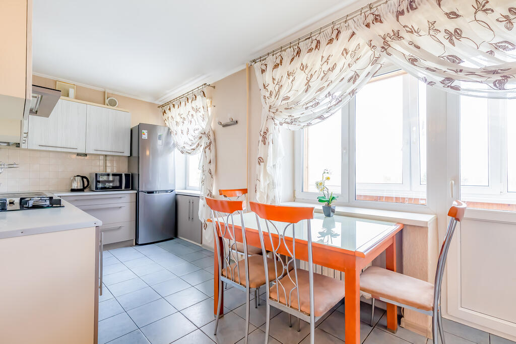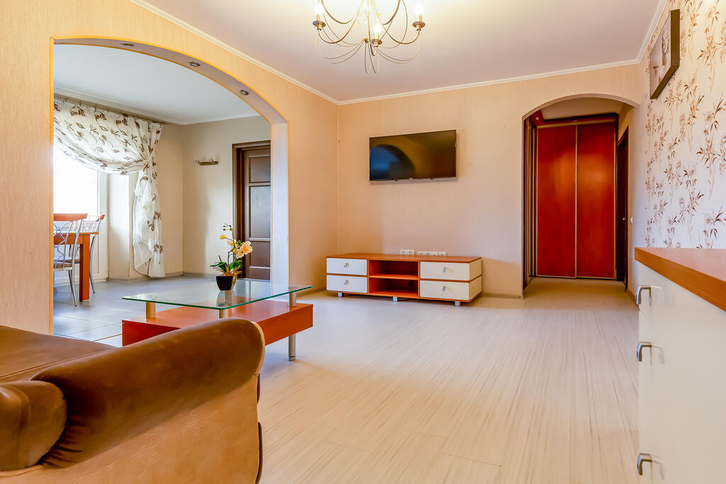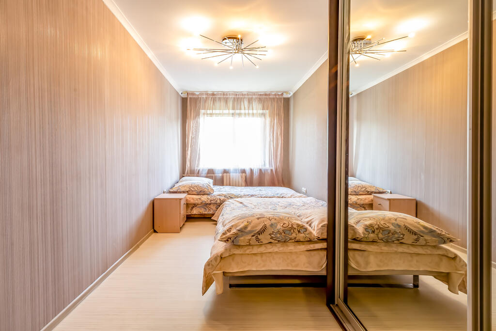 Спальные места: 2+2+2+2+1 (двуспальный диван, 3 двуспальные кровати, 1 односпальная кровать ). Можно разместить 8 гостей. Три комнаты. Застекленный балкон. Санузел совместный. Платная и бесплатная парковки, в том числе для грузовых авто возле дома.
